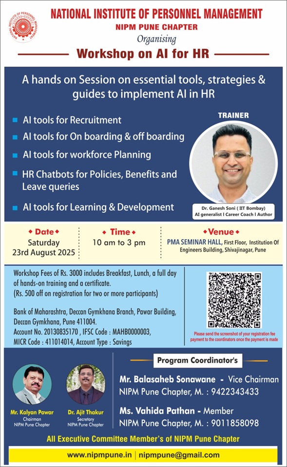 NIPM Pune Chapter Organising Workshop on AI for HR Unlock the power of AI tools & strategies to transform your HR processes!